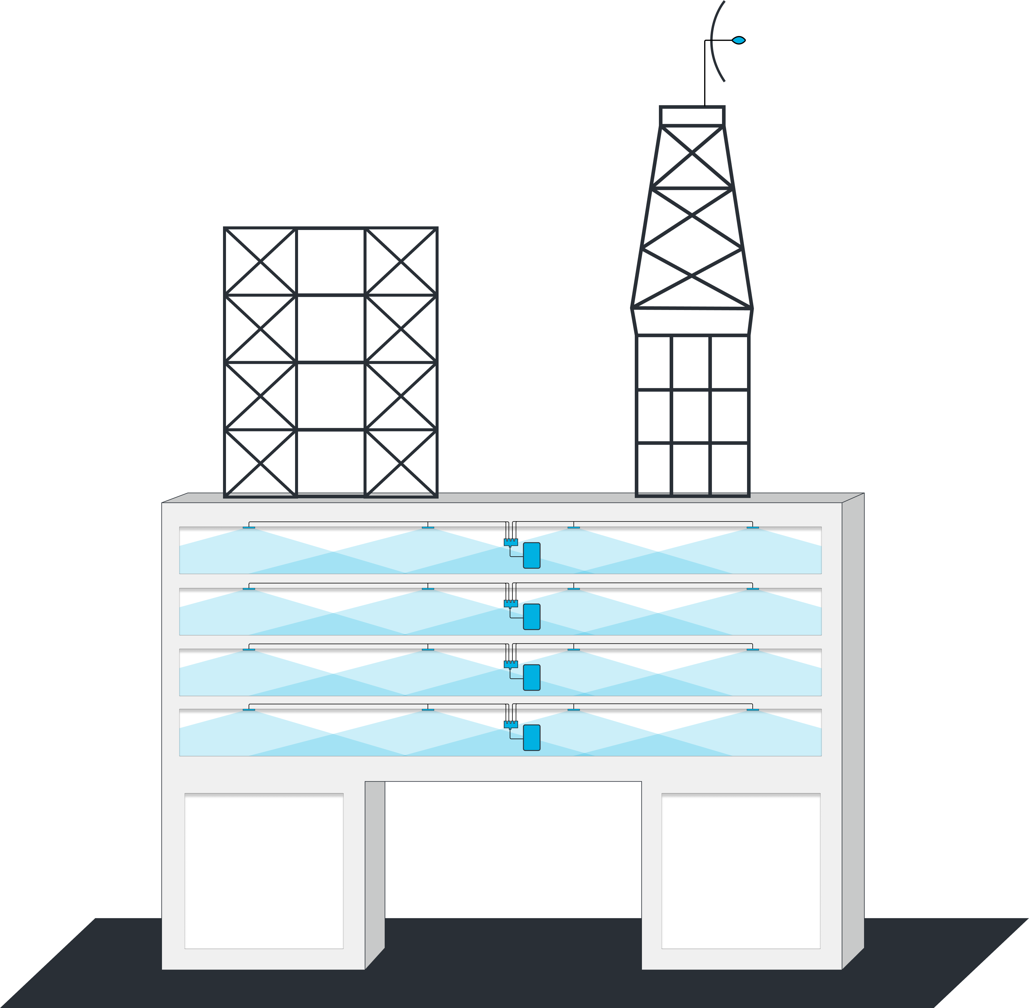 Un’antenna esterna viene installata nel punto più alto della piattaforma, dove capta il miglior segnale di tutti gli operatori mobili fino a 30 km dalla costa. Questo segnale viene amplificato e distribuito in tutte le aree desiderate della piattaforma tramite diverse antenne interne.